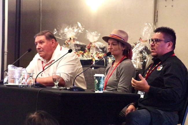 Jason Thompson, owner of Superior Strategies and Warrior Engineering, speaks during the Employers Panel discussion at the Feathers of Hope’s employment gathering on Nov. 28 at the Valhalla Hotel and Conference Centre in Thunder Bay.