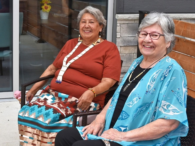 Nipissing First Nation proudly offers Elders homes on their own land. At the grand opening on June 30, Nipissing First Nation citizens Evelyn McLeod and June Commanda enjoy the outdoor sitting lounge at the entrance of the new Duchesnay Elders’ Lodge.