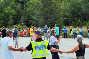On August 14 in Serpent River First Nation, many attendees gathered, blocking the highway, doing a Round Dance in support of stopping the spraying.