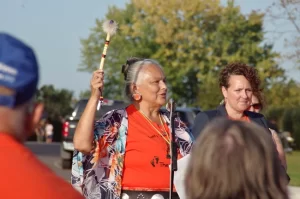 Fort William Elder Sheila DeCorte, who delivered an opening prayer to begin the Flag Raising ceremony, says her Talking Stick is her demonstration of resiliency.