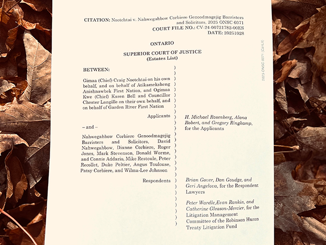 “In a video statement posted on YouTube after Myers’ decision was released, Mike Restoule of Nipissing First Nation, who chairs the Litigation Fund, said community members “are acting in colonial ways” because of the settlement and specifically because of “the recent decision of the Judge in the legal fees assessment case.” Restoule said “That is not our way. Since the beginning of time our ways have always been to take care of each other. Each individual as one to contribute to the overall strength of our nation.”