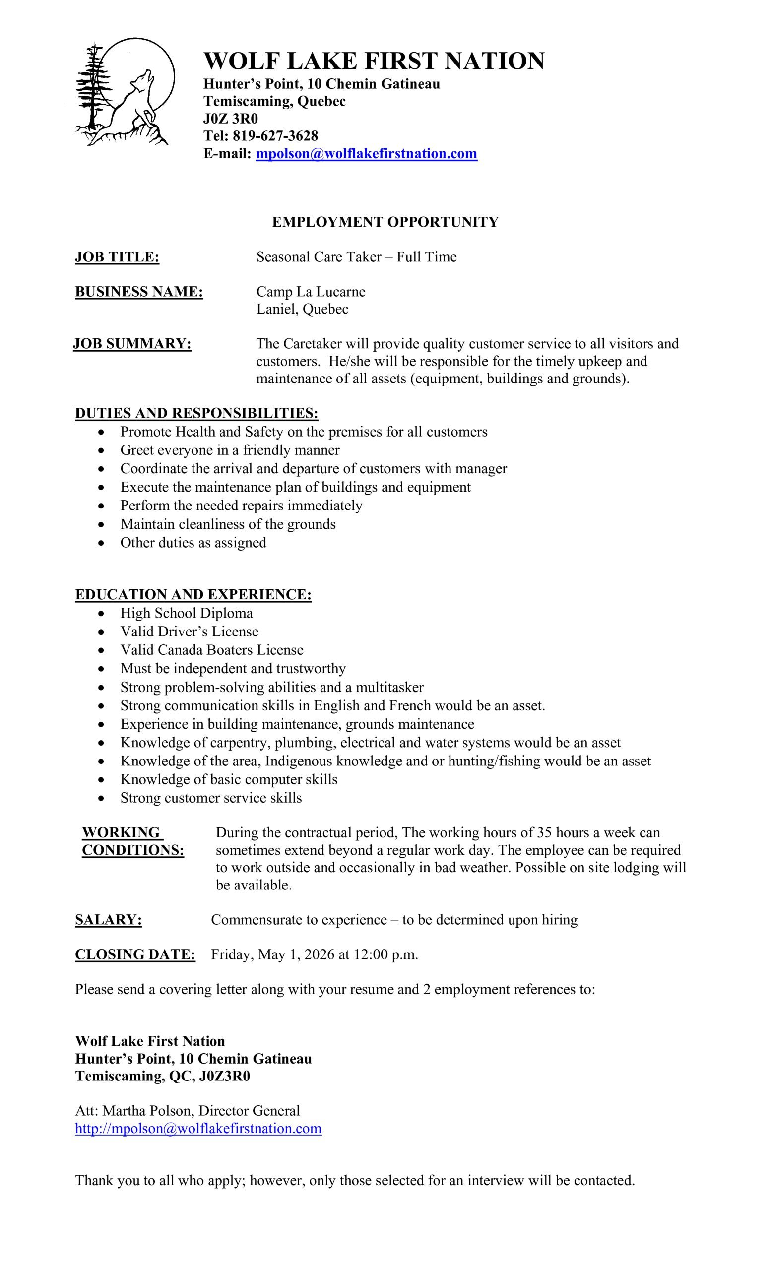 Seasonal Care Taker – Full Time
