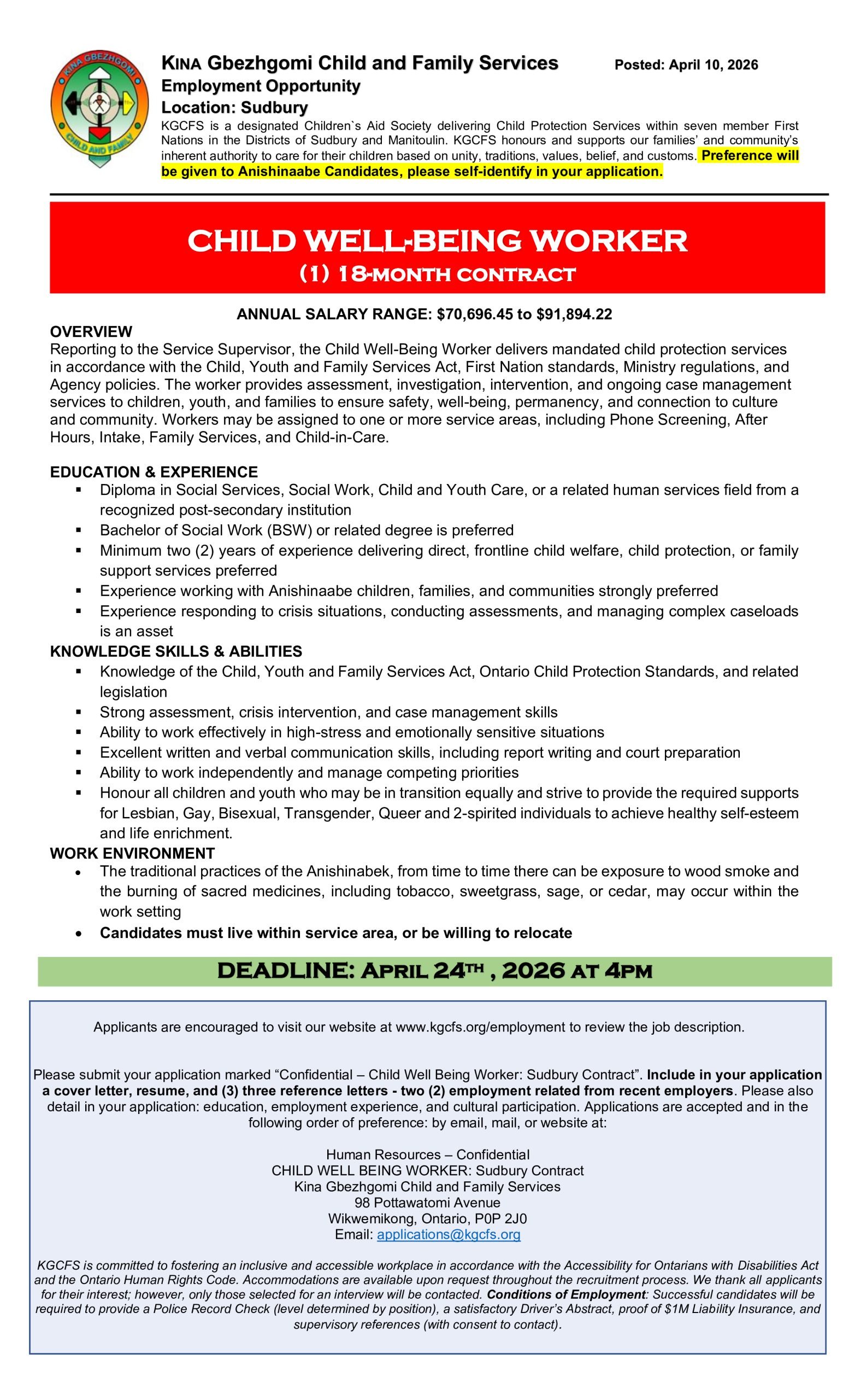 Child Well-Being Worker (Sudbury) Contract Position