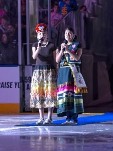 While she sang the anthem solo in the Anishinaabemowin language a year ago, Osawamick was joined by her niece Daisy Sagassige, also a Wiikwemkoong member, for her performance at this year’s match.